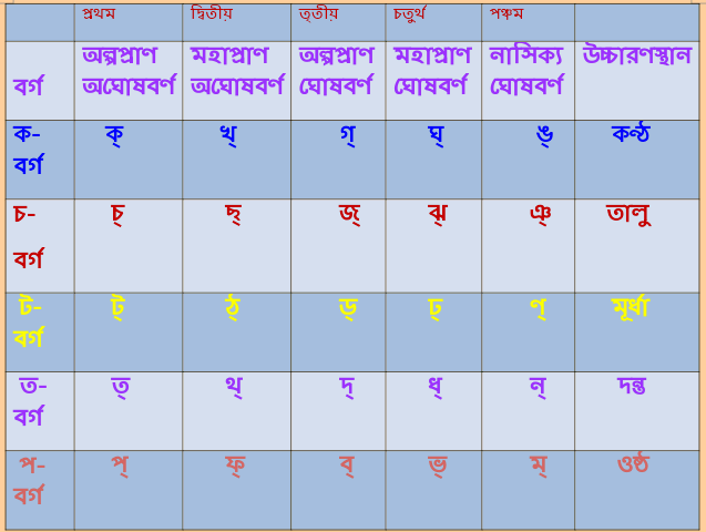 ক.খ.গ. ঘ. ঠ ড. ঢ, ত, থ, দ, ধ, প, ফ, ব, ভ স্পর্শ ব্যঞ্জন ধ্বনি। ‘